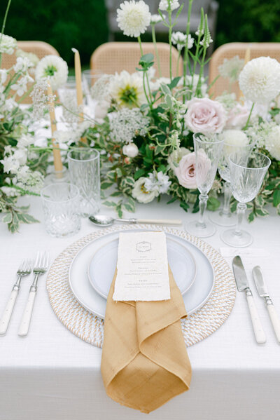 A crisp white plate complemented by a golden napkin adds a touch of warmth and sophistication to the table setting.