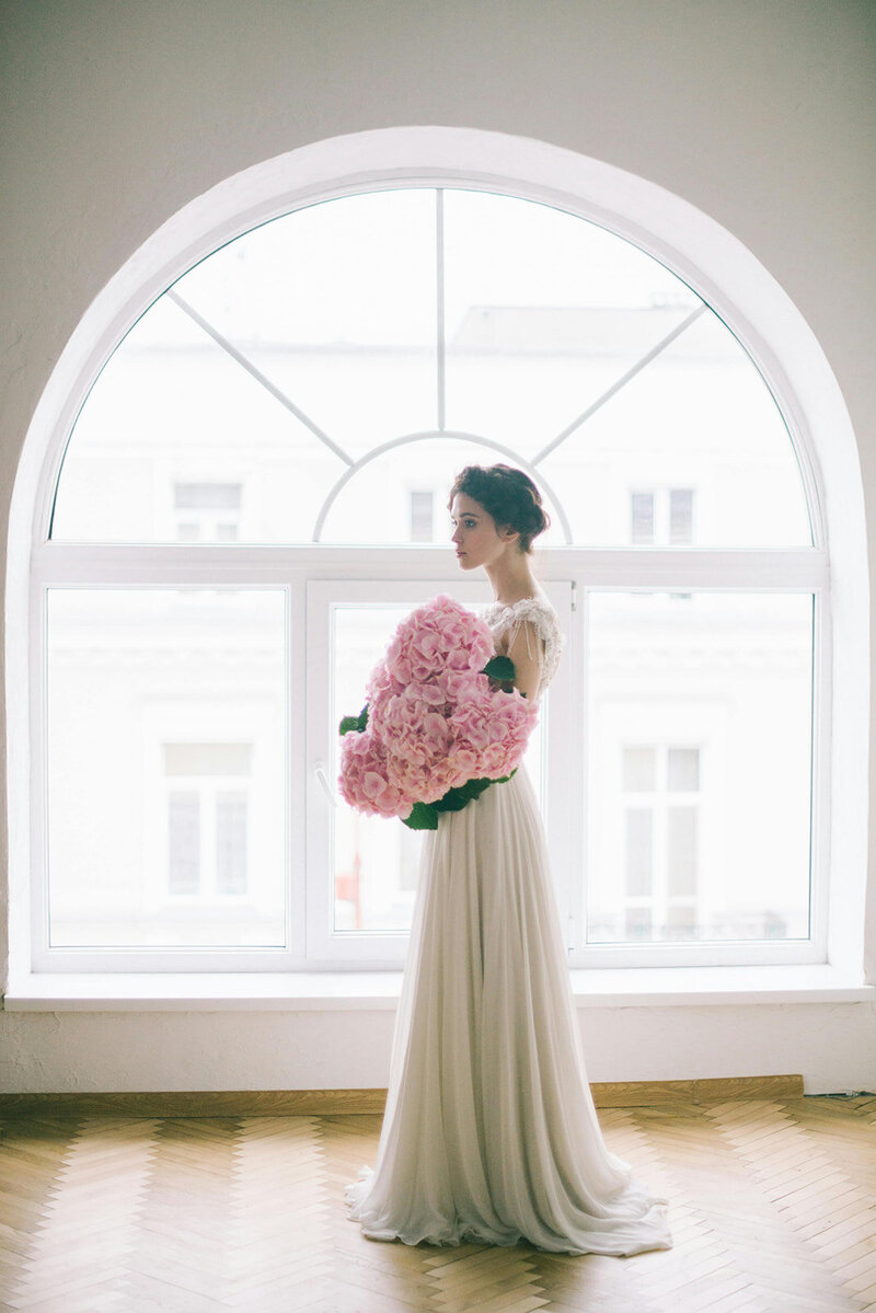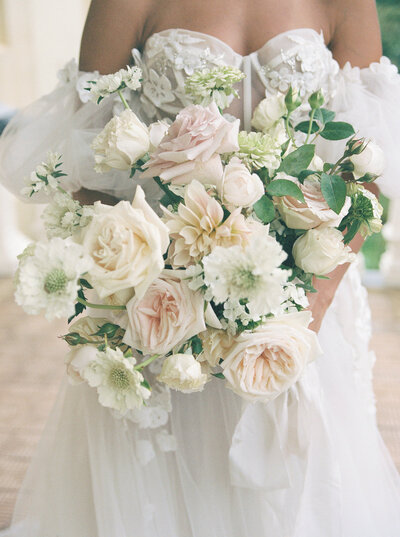 The bouquet features a soft hint of pink, while the ceremony design stays timeless in elegant white.